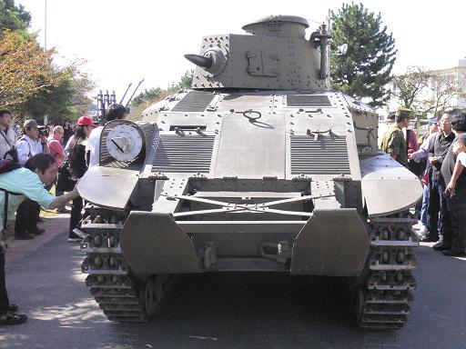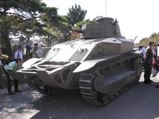 一息付いていると、何やらキャタピラの音が奥からしてきて、時間を見たらまだ12:15なのでそんなはずはないと思いつつ、近づいて行くと、「八九式中戦車」が車庫から展示会場まで移動中でした。